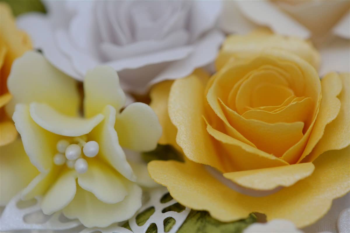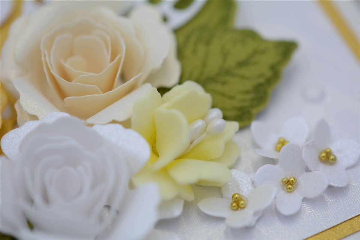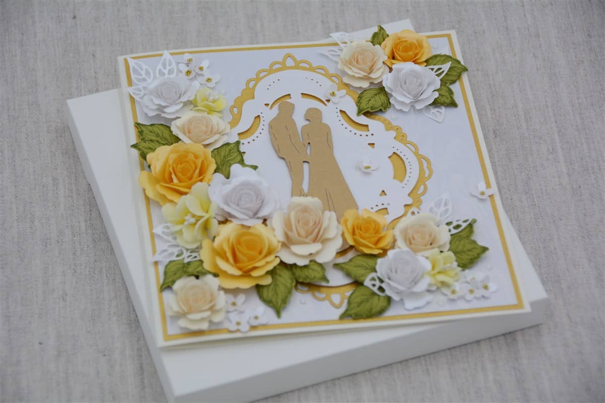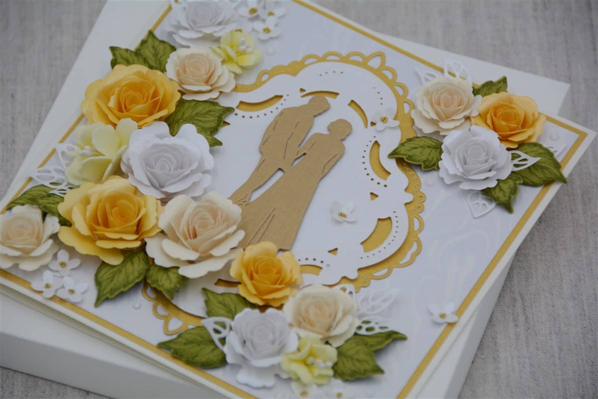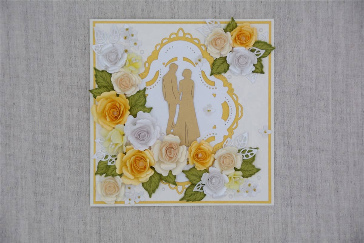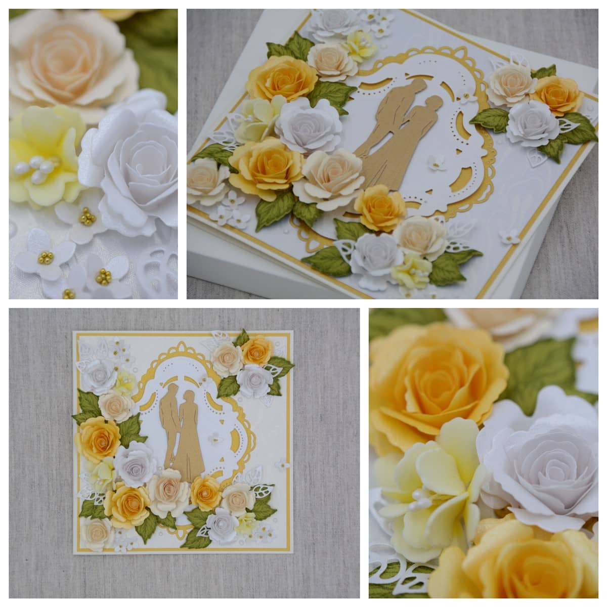 Pulmakaart Teile kahele tekstiga annab edasi kinkija südamlikud õnnesoovid noorpaarile. See kuldse säraga kollaste ja valgete roosidega luksuslikult kaunistatud pulmakaart on võluv ja efektne. Kauni peene pitsmustriga käsitöökaart koos kuldsete pärlitega annab kaardile juurde silmapaistvust, sära ja suursugusust.