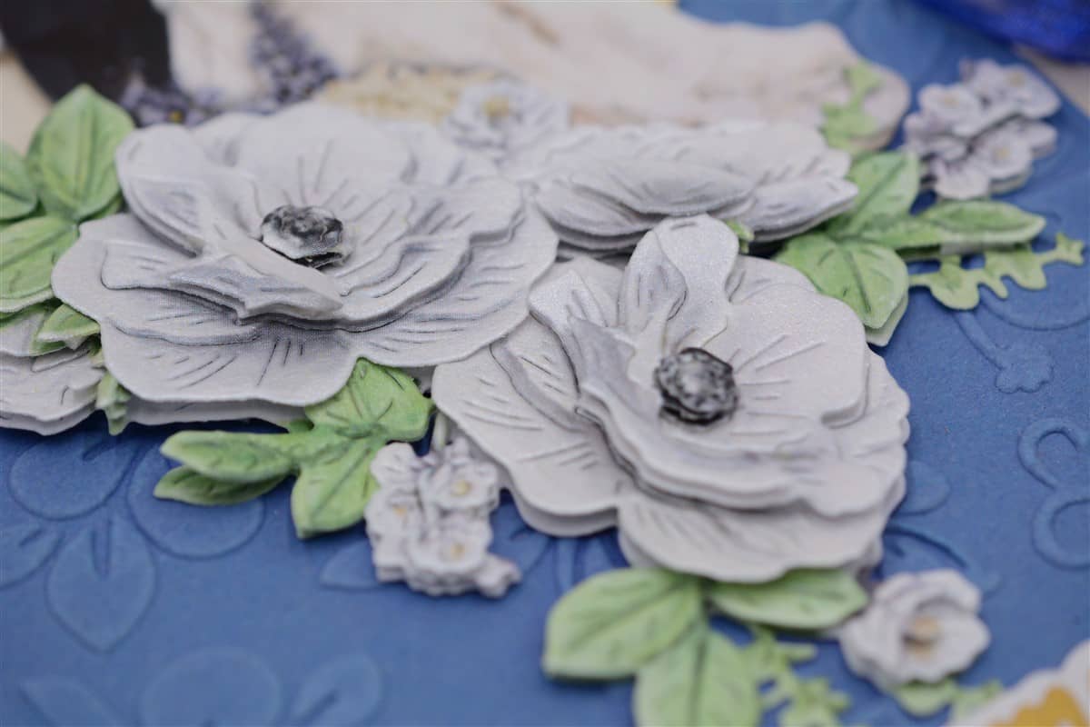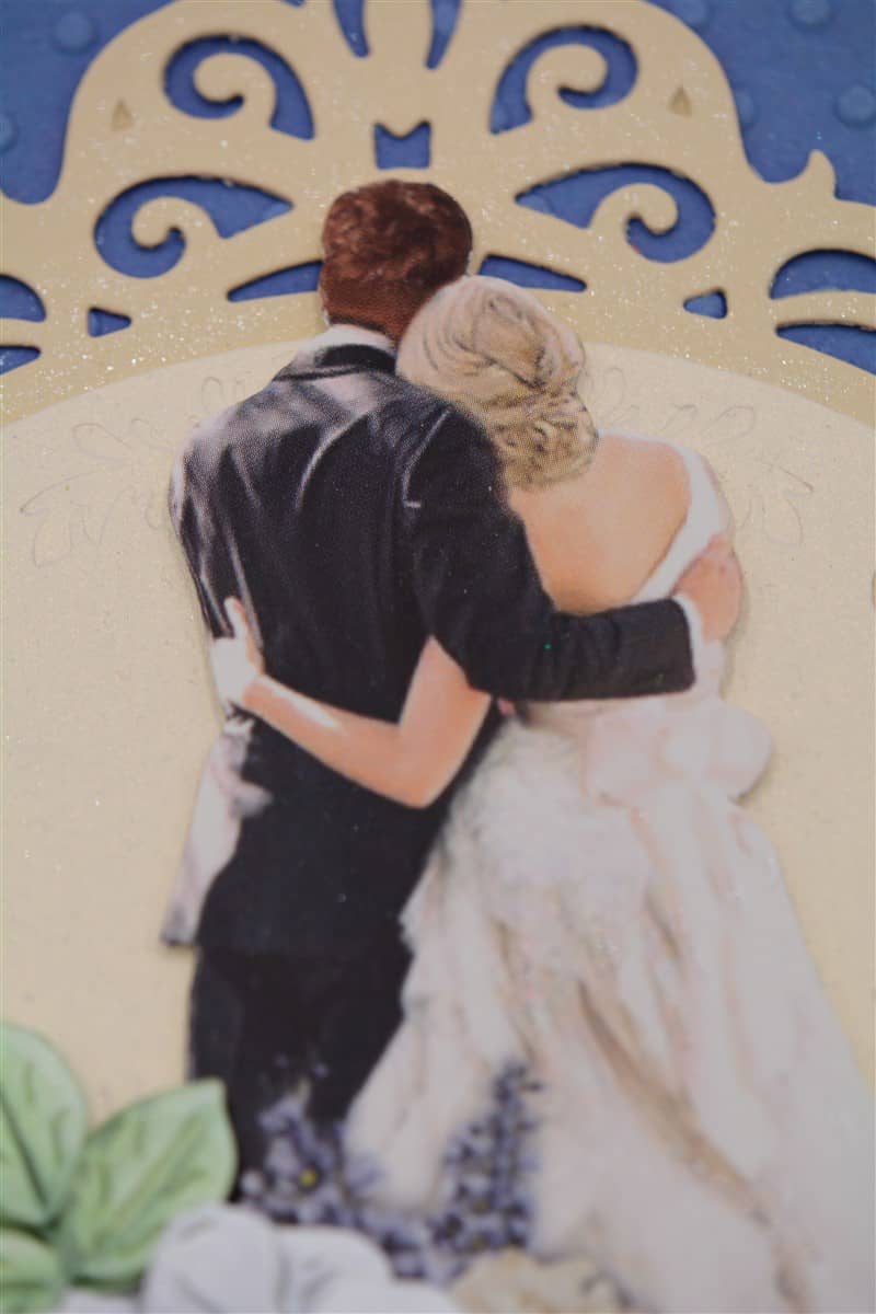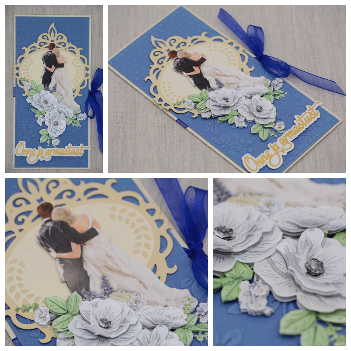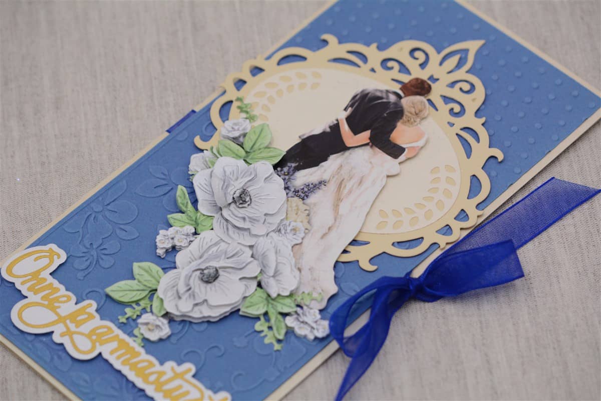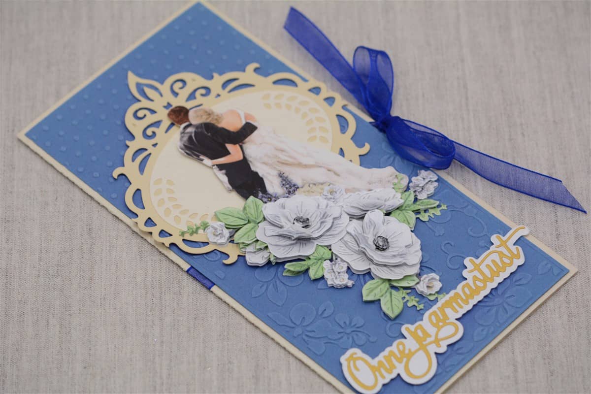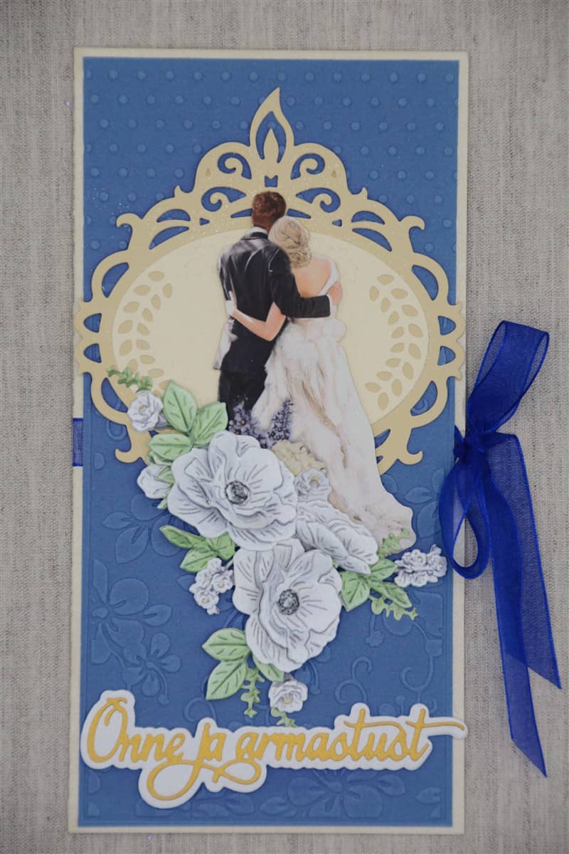 Pastelset tooni pulmakaart on kaunistatud sinise käsitööpaberiga. Kaarti ehivad pitsilised väljalõiked, noorpaari kujutis ja õnnitlustekst. Kaardile on soovi korral võimalik lisada ka rahatasku.