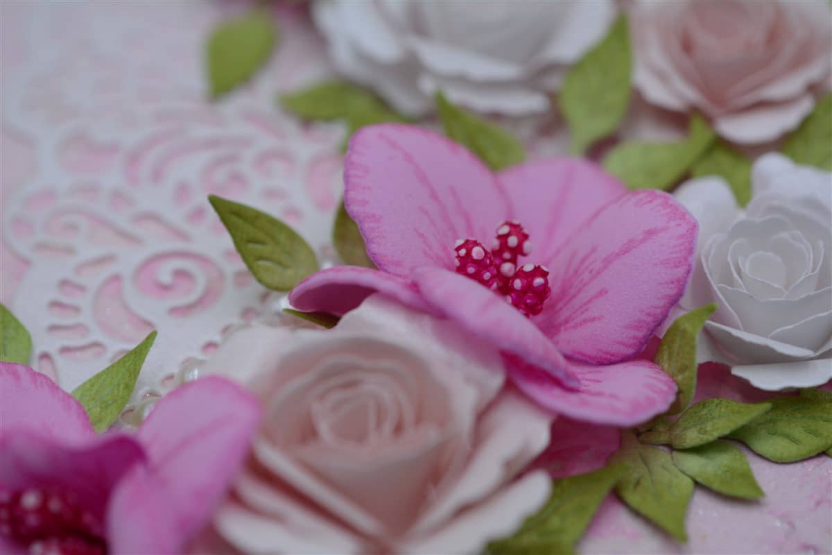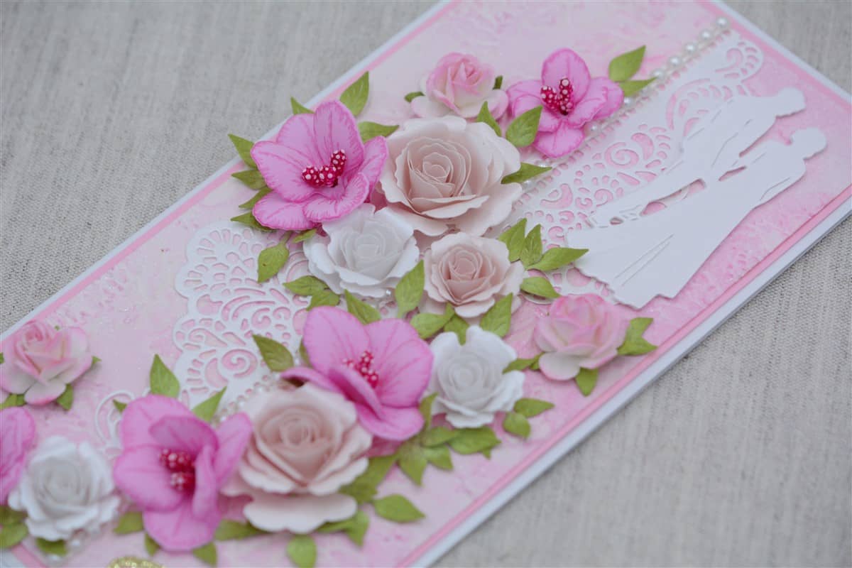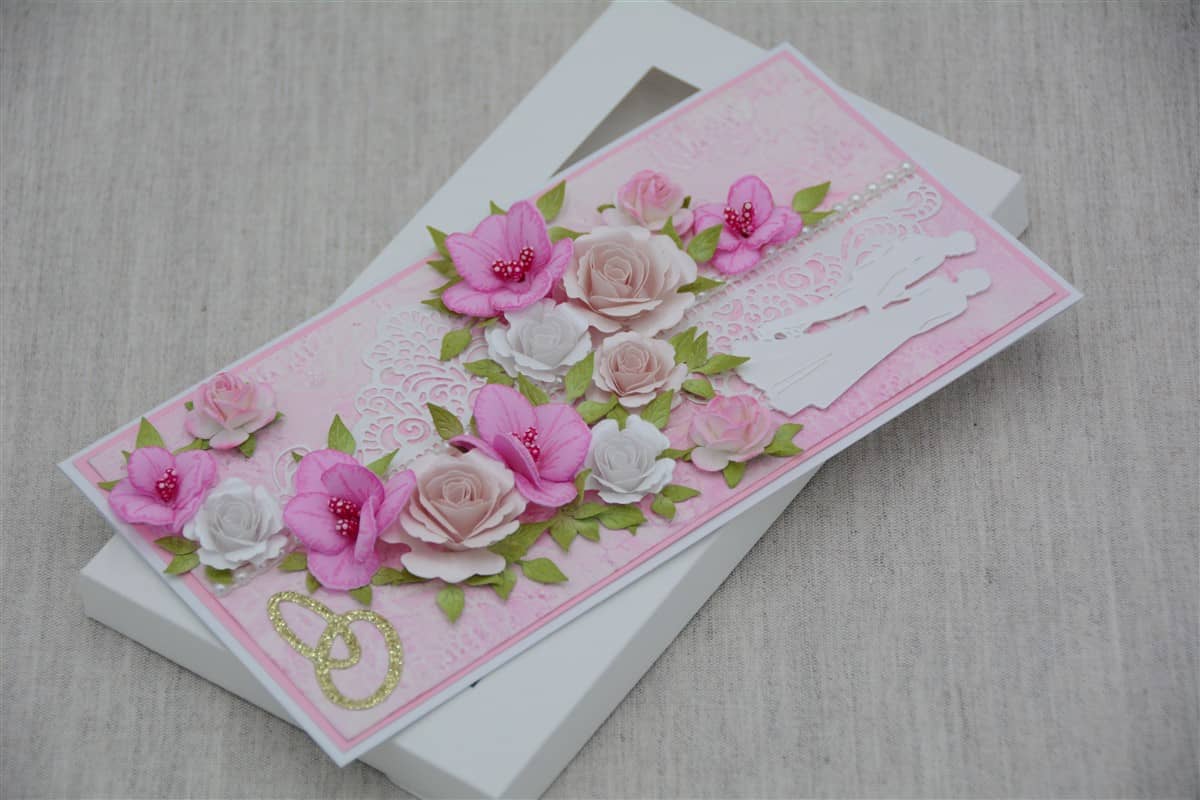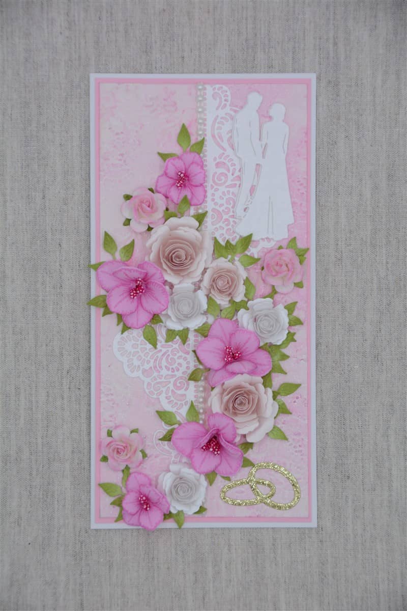 Valgel taustal kaardil annab tooni roosa käsitööpaber ja särav käsitööna valmistatud roosa taust. Taustal on kaunis sissepressitud lillelise efektiga muster, mida on värvitud kauni roosa metallikut sisaldava värviga. Lisaks paberist lõigatud pitsile on kaardil pärlinöör, kuldsed sõrmused, pruutpaari kujutis ning ohtralt käsitöölilli ning aktsendiks ka mõned Mulberry õied. Kaardile on võimalik lisada rahatasku.